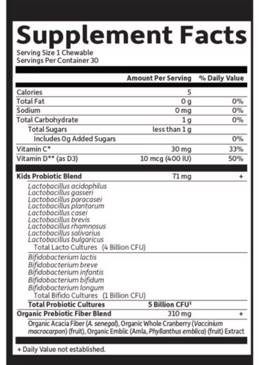 Tato jedinečná probiotická směs byla vytvořena speciáně pro potřeby dětí. Obsahuje rovněž vitamín C z organického ovoce amla (30 mg), vitamín D (400 IU) a prebiotickou vlákninu. Veškeré ingredience jsou pěstovány bez použití toxických pesticidů, antibiotik, hormonů.