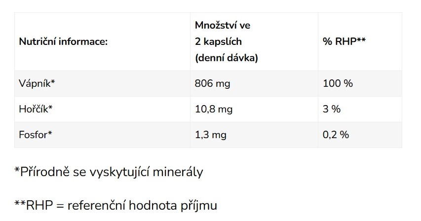 uhličitan vápenatý z vaječných skořápek, uhličitan hořečnatý, fosforečnan vápenatý, veganská kapsle z hydroxypropylmethylcelulózy