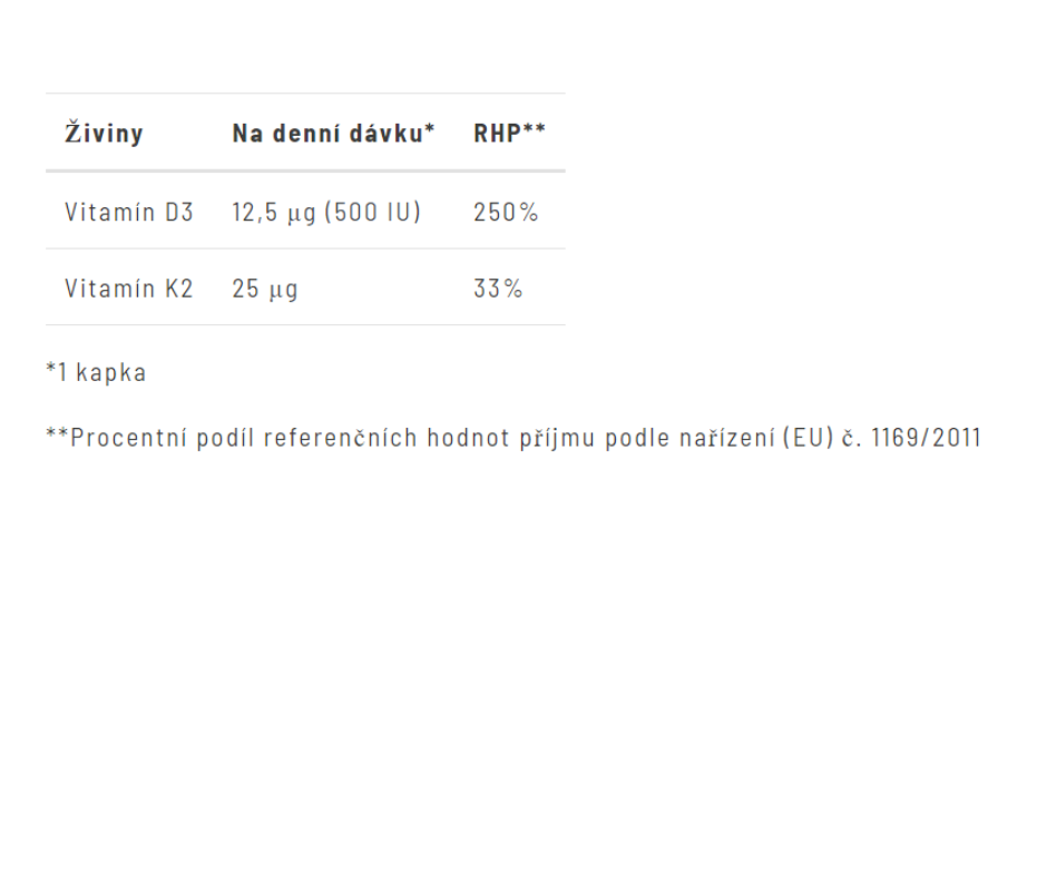 MCT (triglyceridy se středně dlouhým řetězcem), vitamín D (cholekalciferol z lišejníku), vitamín K2 (menachinon MK-7 all trans).