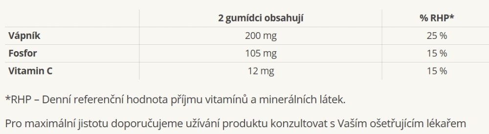 Složení ve 2 gumídcích: sladidlo (maltitol), vápník a fosfor (vápenaté soli kyseliny ortofosforečné), pektin (prebiotická vláknina), regulátor kyselosti (kyselina citronová, citronan sodný), přírodní aroma, vitamin C (kyselina askorbová), koncentrát z mrkve a černého rybízu, leštící látka: karnaubský vosk.
